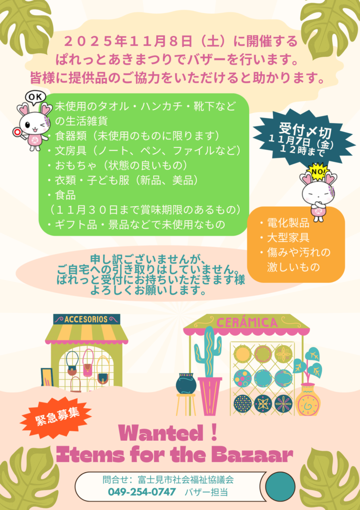 11月8日土曜開催の「ぱれっとあきまつり」で、バザーを行います。市民の皆さまに提供品のご協力をいただけると助かります。